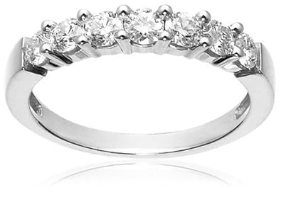 The 14 K White Gold Round Diamond Ring by Amazon Collection comes with 7 round stone Diamond ( 3/4 cttw) form a band of brilliance that spans the top of this 14 karat gold ring. The stones are held in shared prong settings that show them off beautifully. Minimum Color is H-I and I1-I2 for clarity. A polished gold band with clean lines and squared edges completes the design. This ring is available in your choice of white or yellow gold and can be resized up or down by 1/2 size.